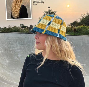 Get summer-ready with this fun and patriotic crochet bucket hat β perfect for sunny days, seaside walks, or cheering on your team! The Sverige-hatt (Sweden Hat) features a striking plaid pattern in four fresh colours: mustard yellow, light yellow, dove blue, and petrol. Made with soft cotton yarn and worked in the round using intarsia technique, the hat combines bold visual impact with practical structure.