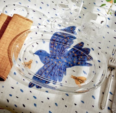 This project was inspired by a beautifully styled table I came across, set with a white cloth printed with bold cobalt-blue birds and tiny ochre bees in a scattered sky of dashes. The look was whimsical and folk-art inspired – like something from a modern fairy tale. I immediately knew it would be perfect to recreate with lino printing. Its from Alekos Fassiano.