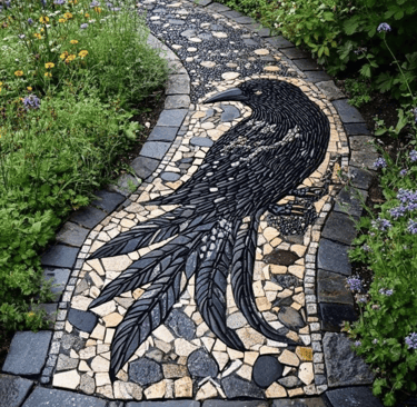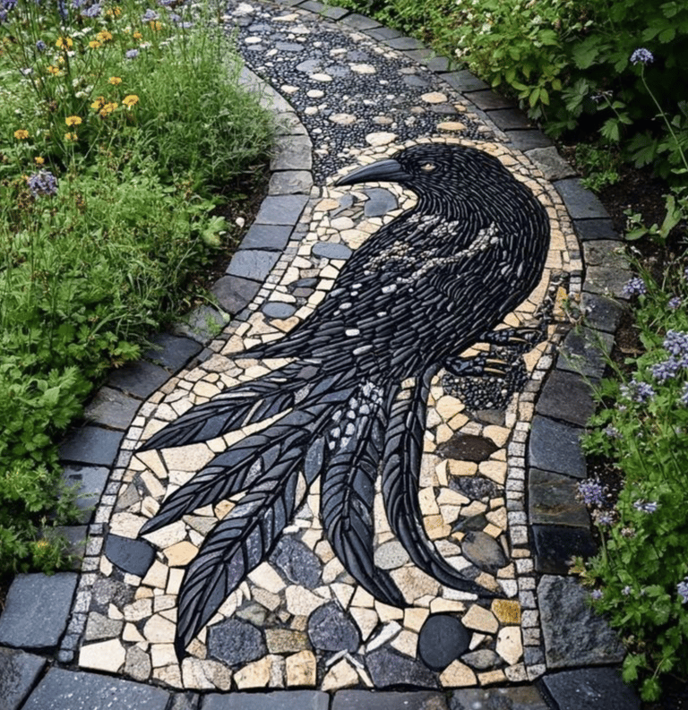 The bee and raven mosaic tile is just one example of what you can create with natural materials and a little imagination. Try leaves, sun motifs, initials, or even a tiny mosaic portrait of your pet — the only limit is your creativity.